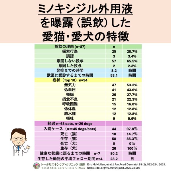 この論文では、ミノキシジル外用液を誤って摂取してしまった猫と犬の合計94例の報告をまとめています。