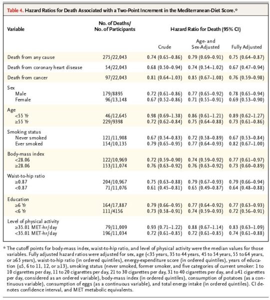 NEJM報告:0~9点の地中海スケールが高いほど心血管疾患や癌による死亡リスクが減少する。