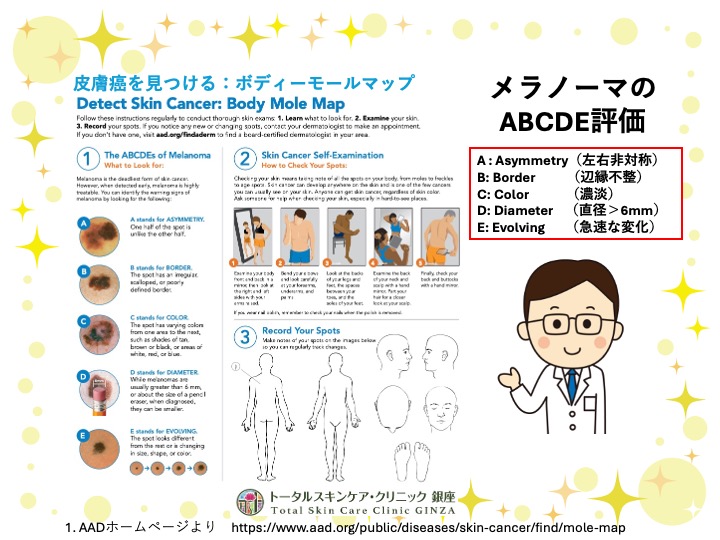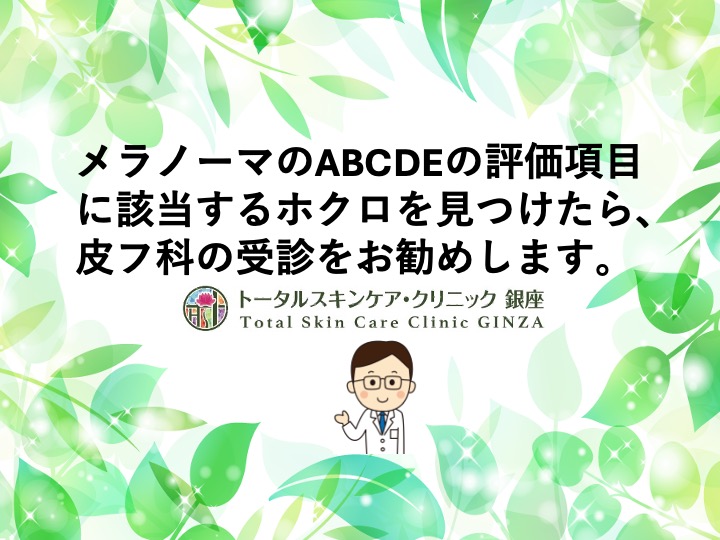 メラノーマのABCDE評価の項目に該当するホクロを見つけたら、皮フ科の受診をお勧めします。